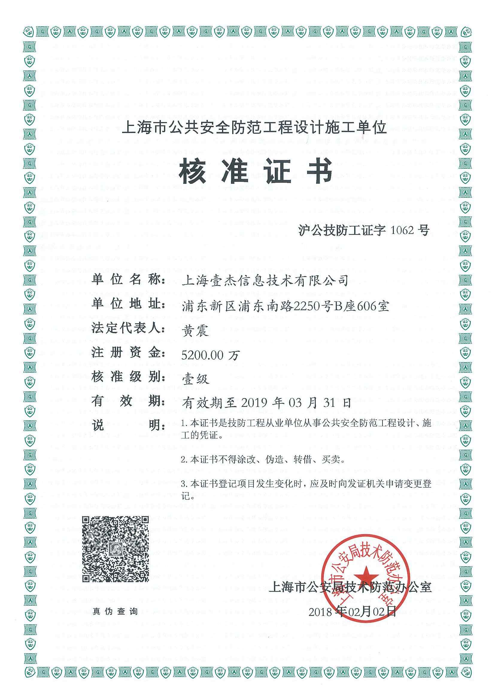 上海市公安局颁发的安全技术防范工程设计施工壹级资质